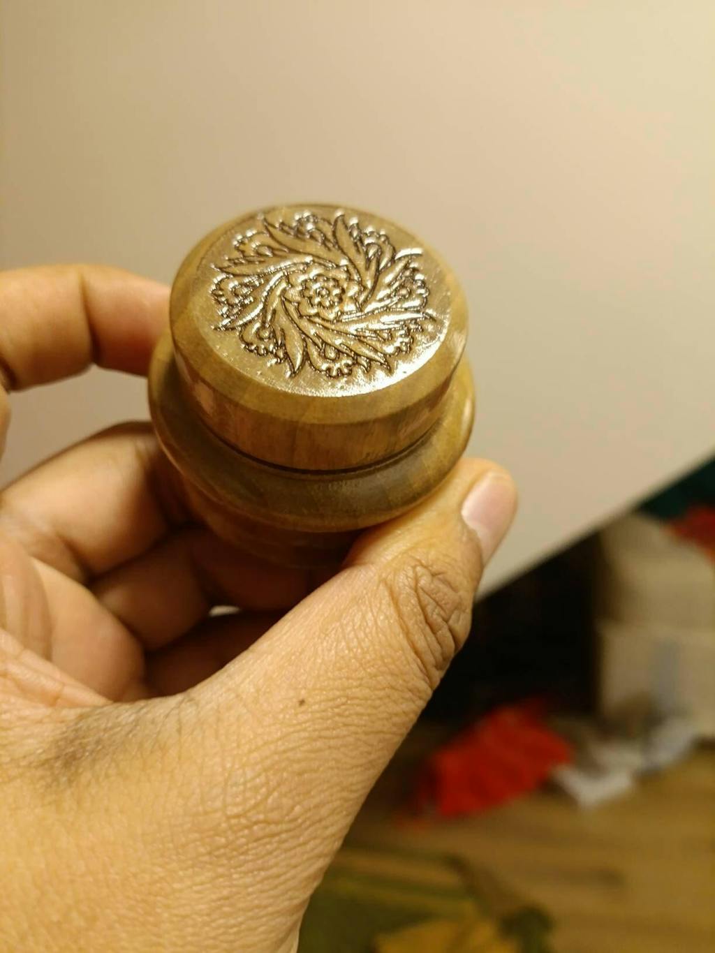 This beautifully crafted small wooden inkwell features carved lid and fixed plastic insert and is available with different patterns on the lid.