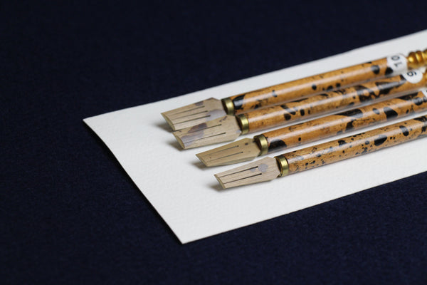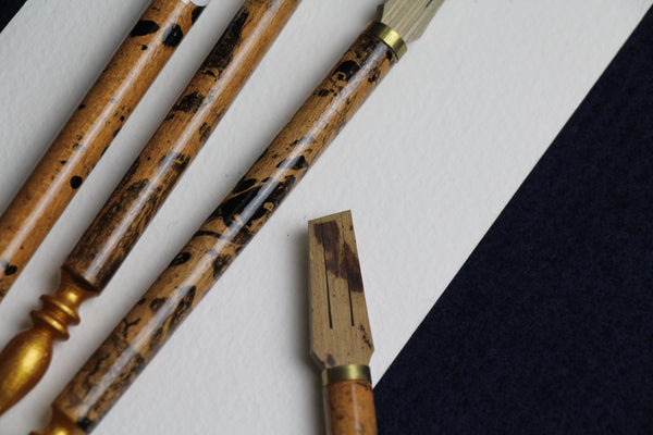 Our bamboo nibs have been made from spotted bamboo - a stronger bamboo variety making them last considerably longer between cuts. Nibs are set in beautiful turned wood handles.