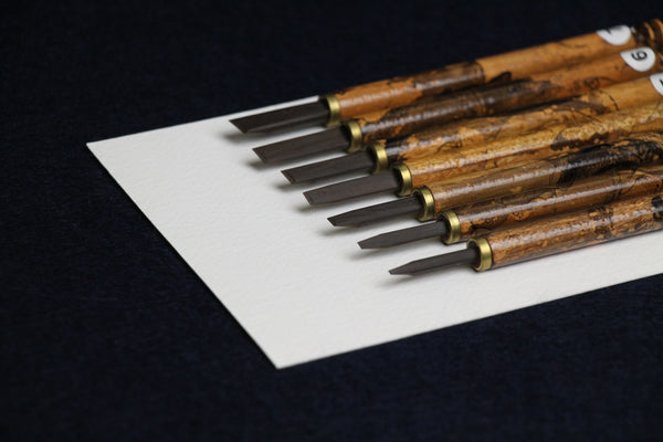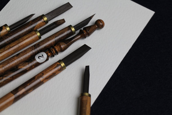 This set contains 7 pens with left oblique nibs in sizes 1, 2, 3, 4, 5, 6 and 7 mm. Nibs are set into elegant wooden handles painted with light brown/black marble effect.